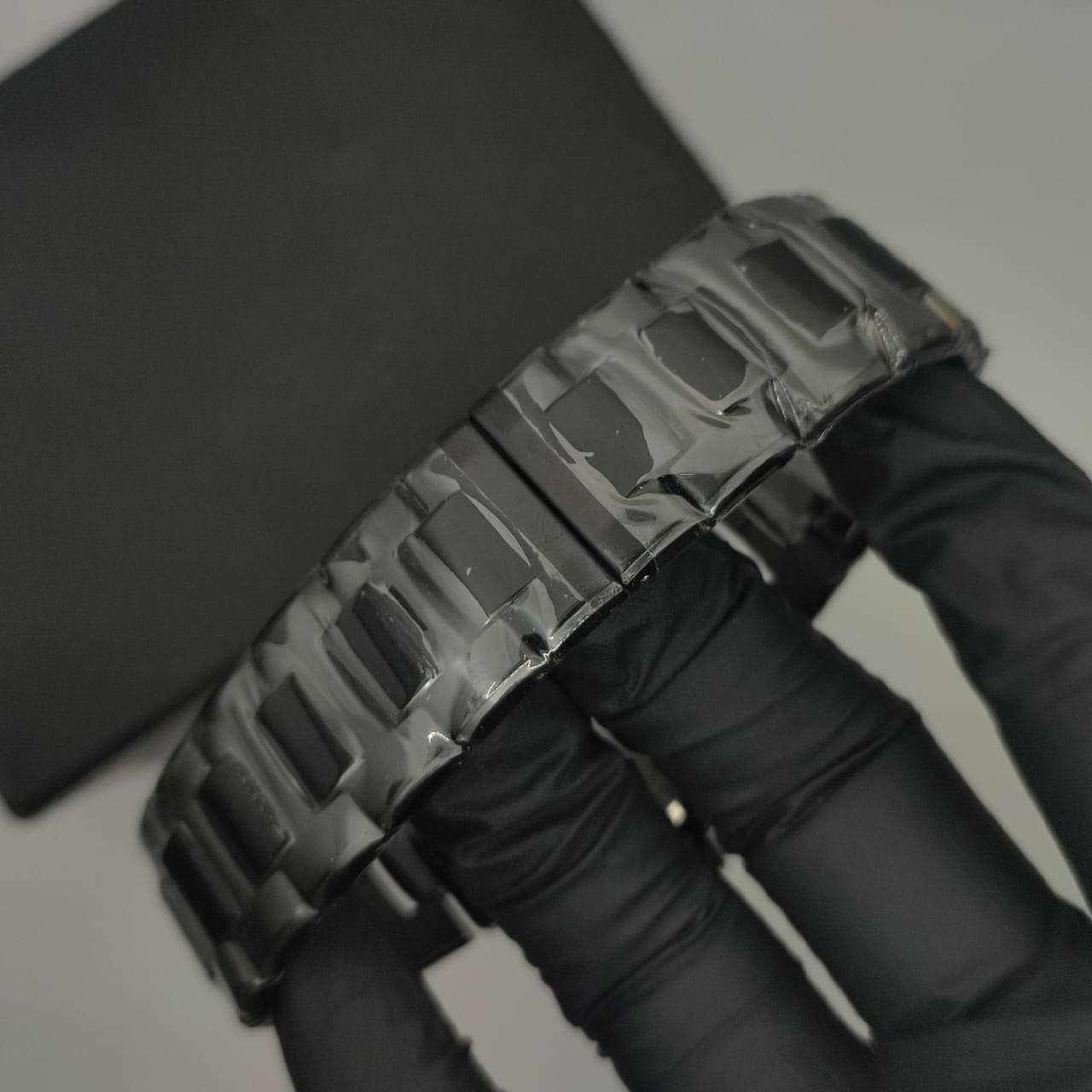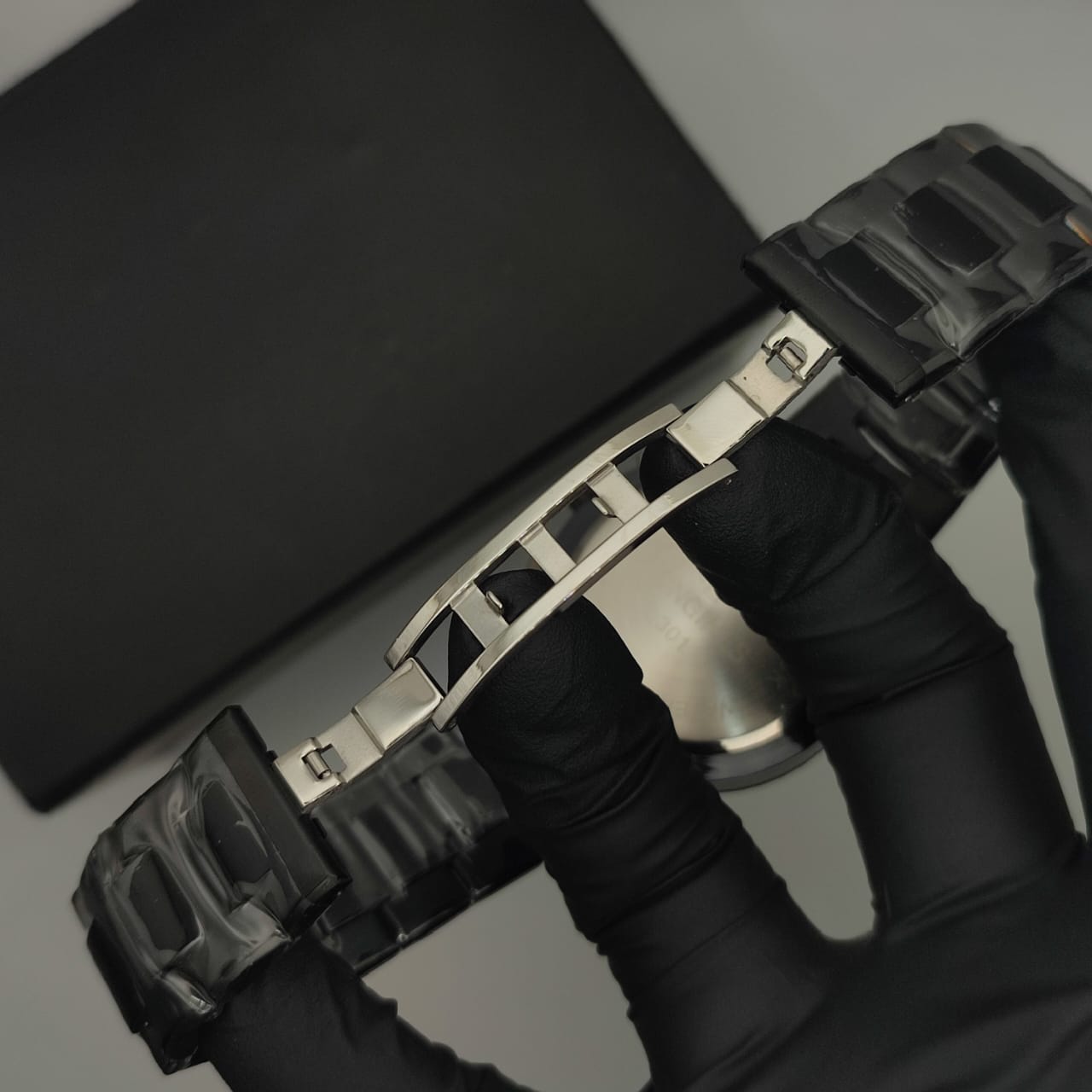 - Dial: Black with White chronograph sub-dials